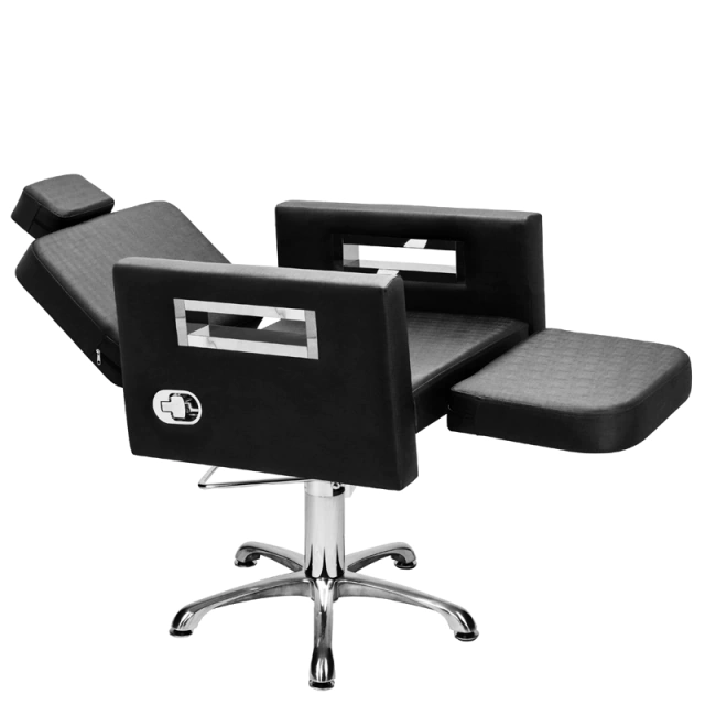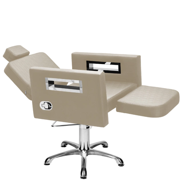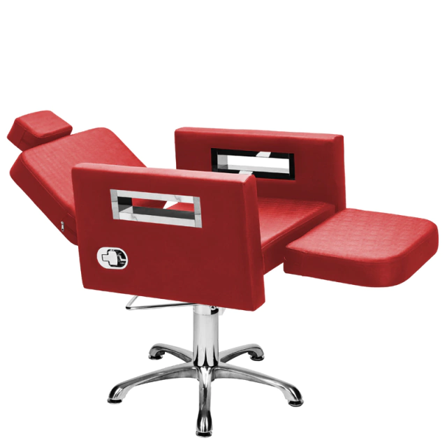 Com um design clean e autêntico, assento amplo e robusto, encosto reclinável com acionamento por botão e apoio de pernas estofado com regulagem de altura ideal para procedimentos faciais de longa duração, espuma de alta densidade e tecido courino com opções de cores variadas, braços com acabamento em inox, base hidráulica altamente resistente com trava para o giro que suporta até 180kg.