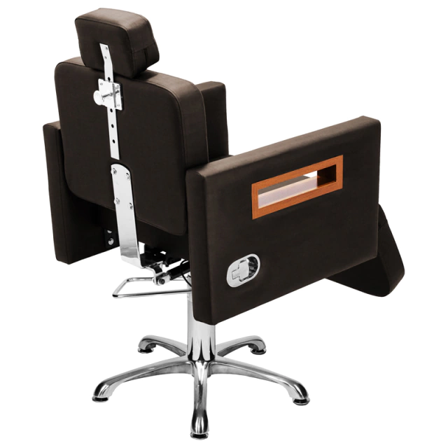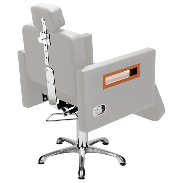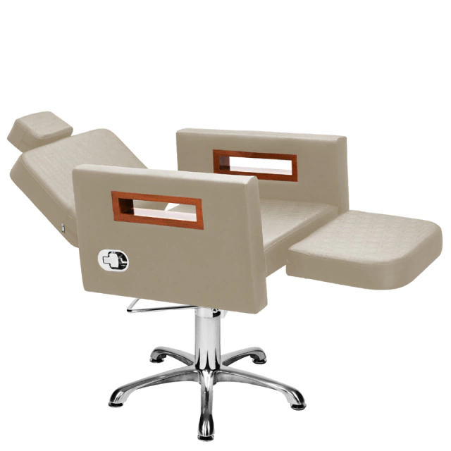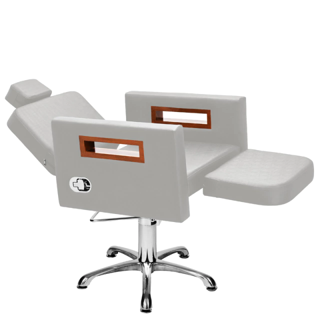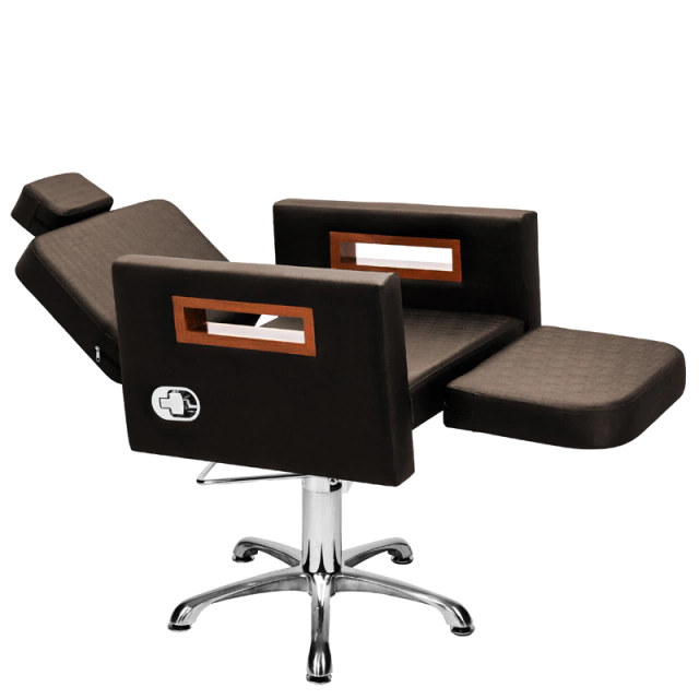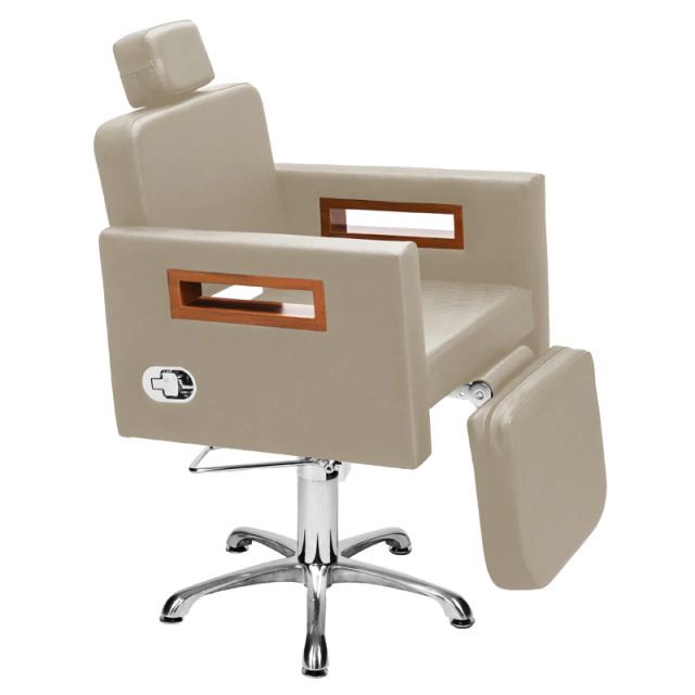 Com um design clean e autêntico, assento amplo e robusto, encosto reclinável com acionamento por botão e apoio de pernas estofado com regulagem de altura ideal para procedimentos faciais de longa duração, espuma de alta densidade e tecido courino com opções de cores variadas, braços com acabamento em madeira, base hidráulica altamente resistente com trava para o giro que suporta até 180kg.
