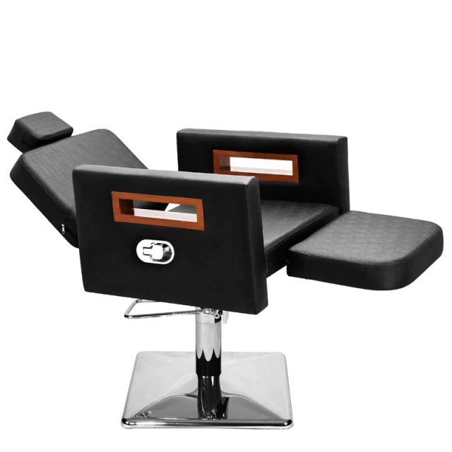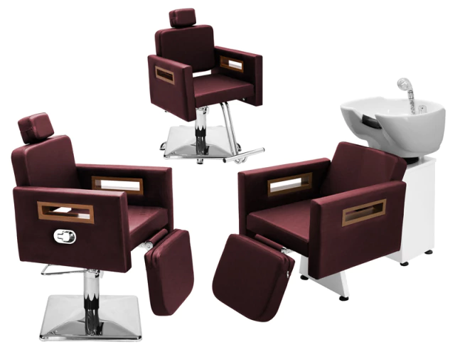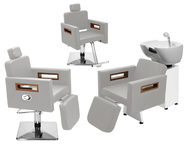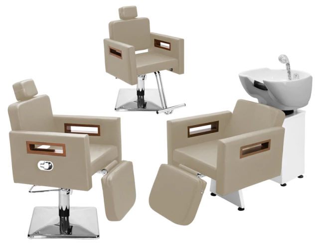 - 01 Cadeira Tunísia Fixa: Com um design clean e autêntico, assento amplo e robusto, encosto fixo ideal para cortes, penteados e escova, espuma de alta densidade e tecido courino com opções de cores variadas, braços com acabamento em madeira, apoio de pés em ferro com acabamento cromado, base hidráulica altamente resistente com trava para o giro que suporta até 180kg.