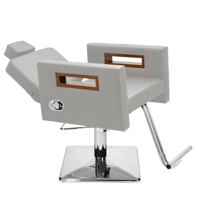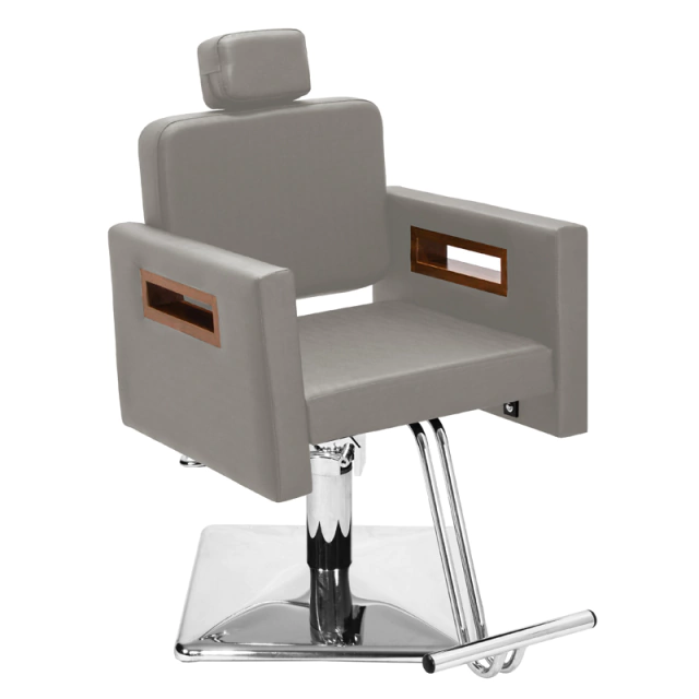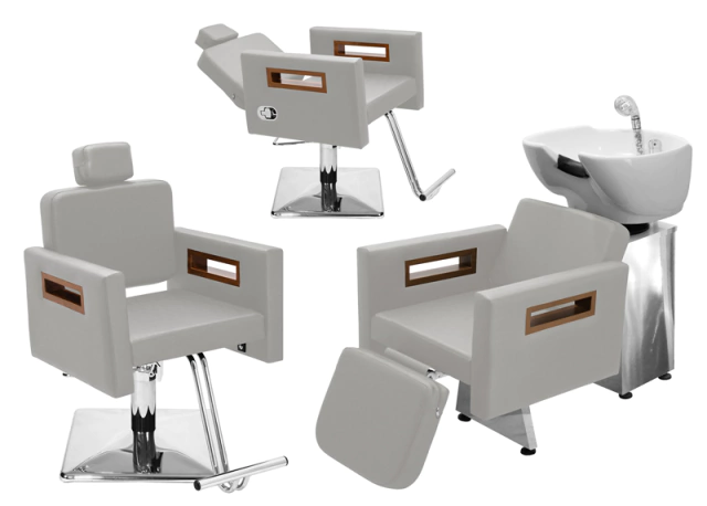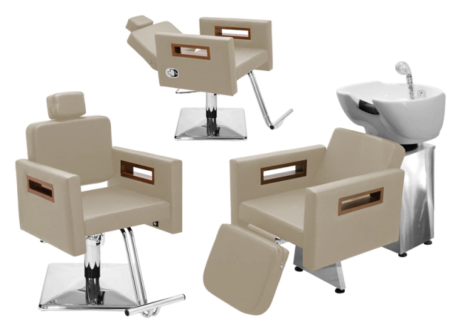 - 01 Cadeira Tunísia Fixa: Com um design clean e autêntico, assento amplo e robusto, encosto fixo ideal para cortes, penteados e escova, espuma de alta densidade e tecido courino com opções de cores variadas, braços com acabamento em madeira, apoio de pés em ferro com acabamento cromado, base hidráulica altamente resistente com trava para o giro que suporta até 180kg.