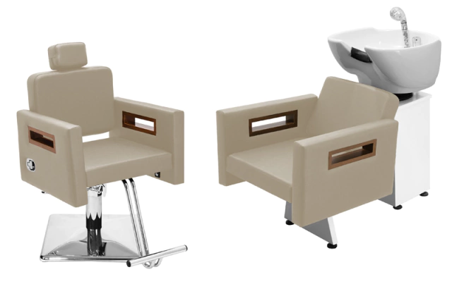 - 01 Cadeira Tunísia Reclinável: Com um design clean e autêntico, assento amplo e robusto, encosto reclinável com acionamento por botão ideal para procedimentos faciais, espuma de alta densidade e tecido courino com opções de cores variadas, braços com acabamento em madeira, apoio de pés em ferro com acabamento cromado, base hidráulica altamente resistente com trava para o giro que suporta até 180kg.